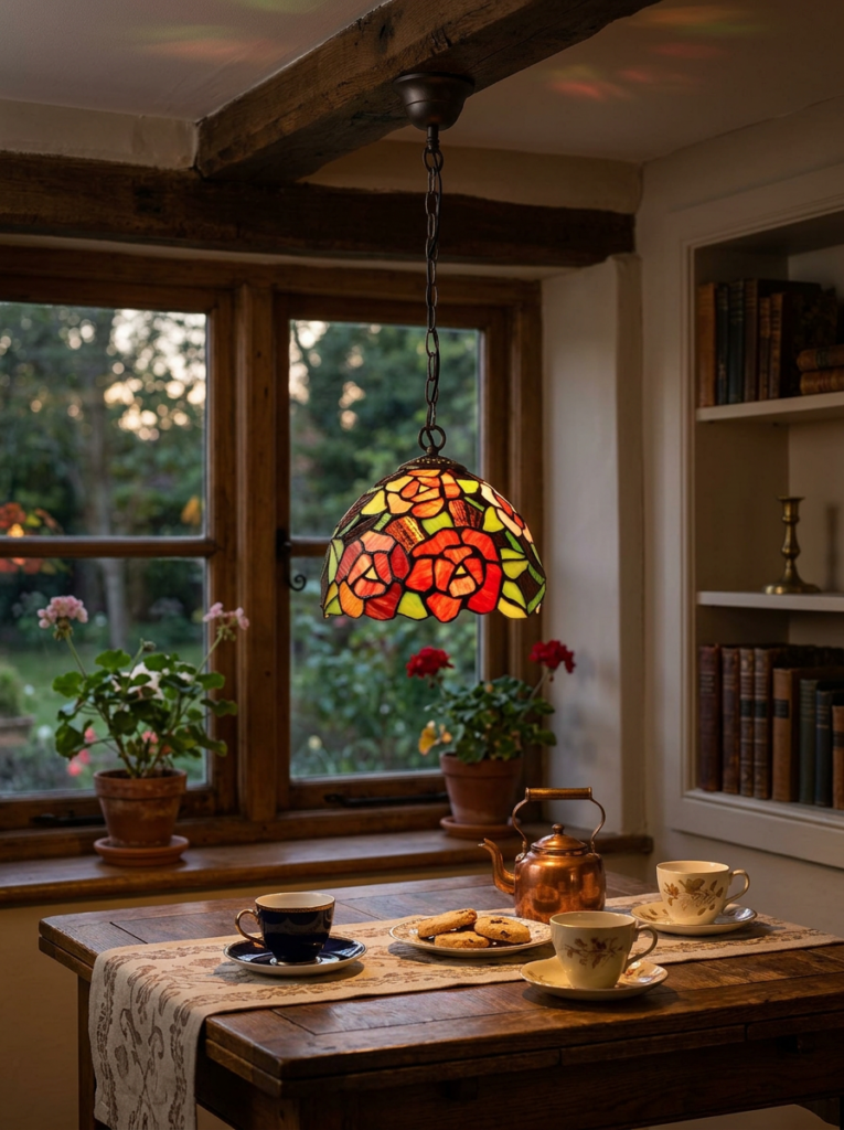 Tiffany Hängelampe New York 20 cm – Glaslampe mit Rosenmotiv