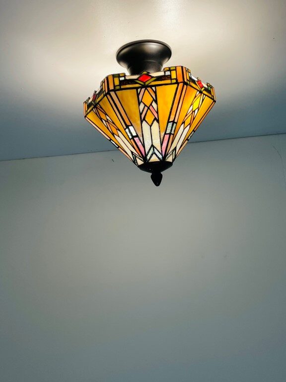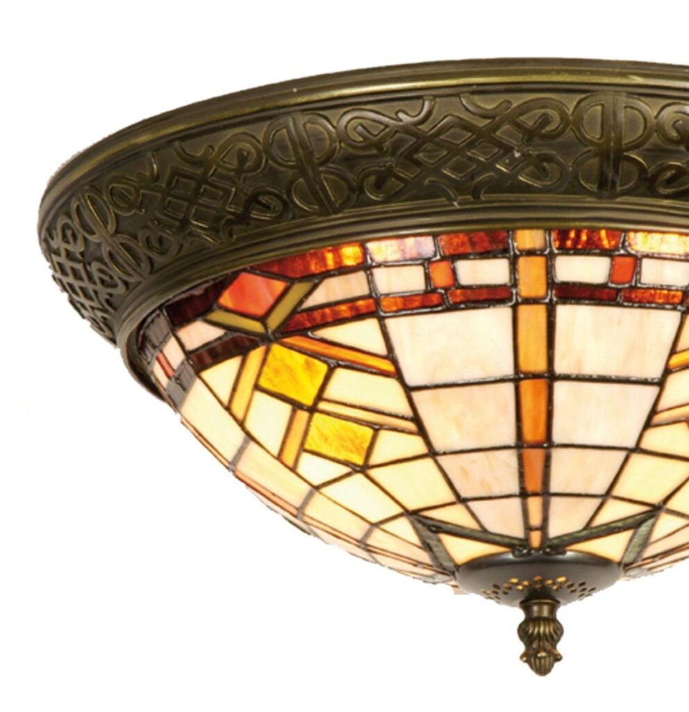 Schöne Tiffany Art Deco Deckenlampe in warmen Tönen wie Beige und Braun mit schönen roten Akzenten