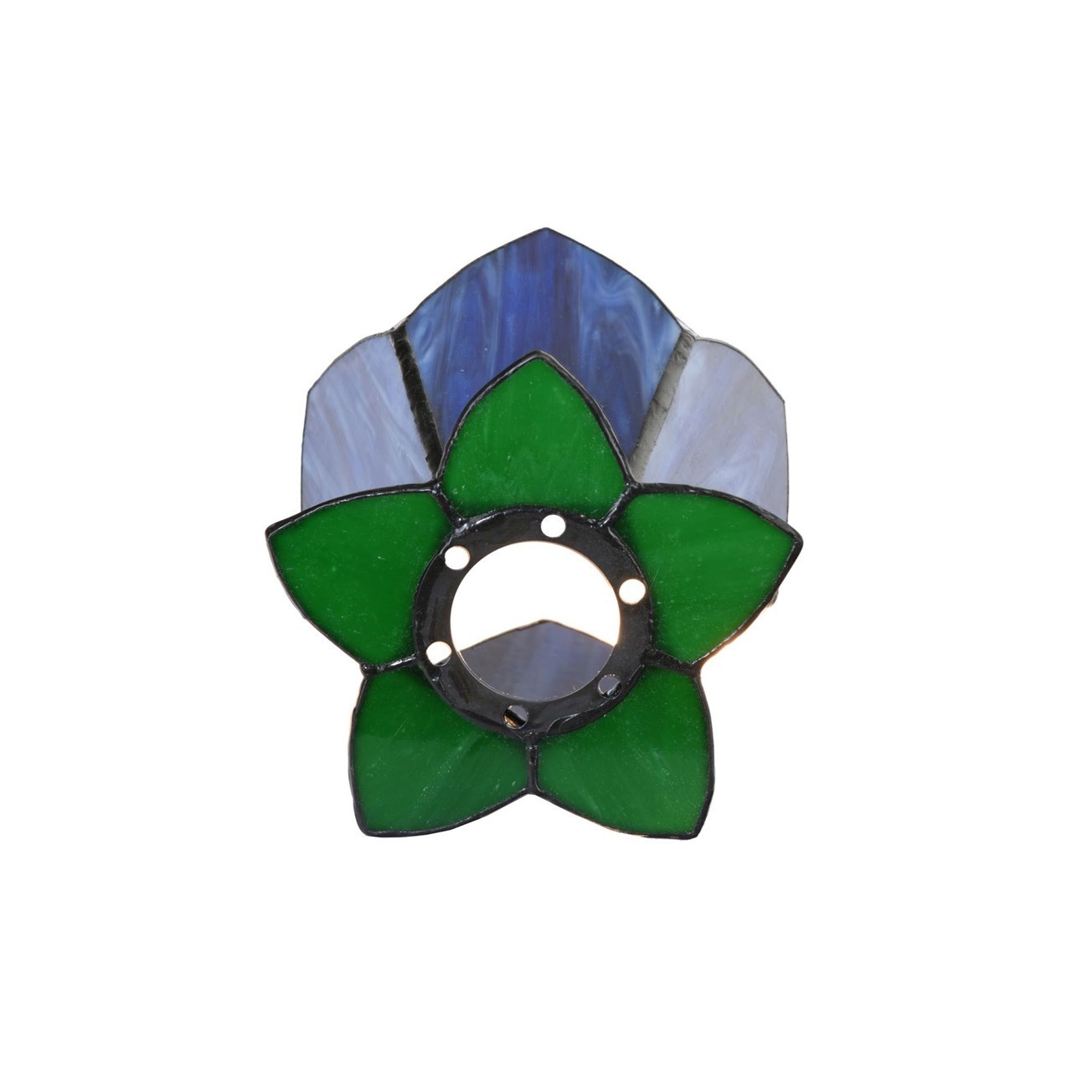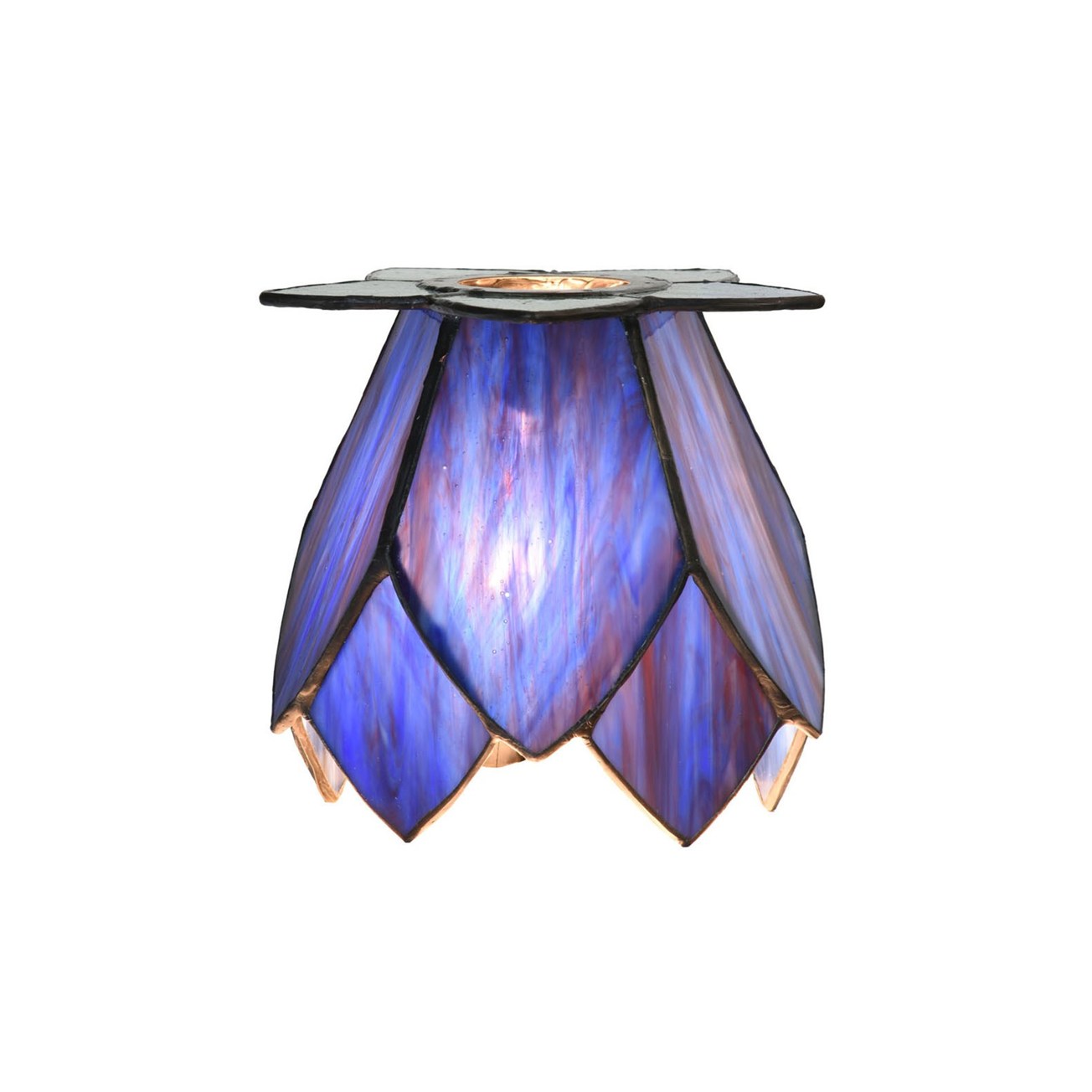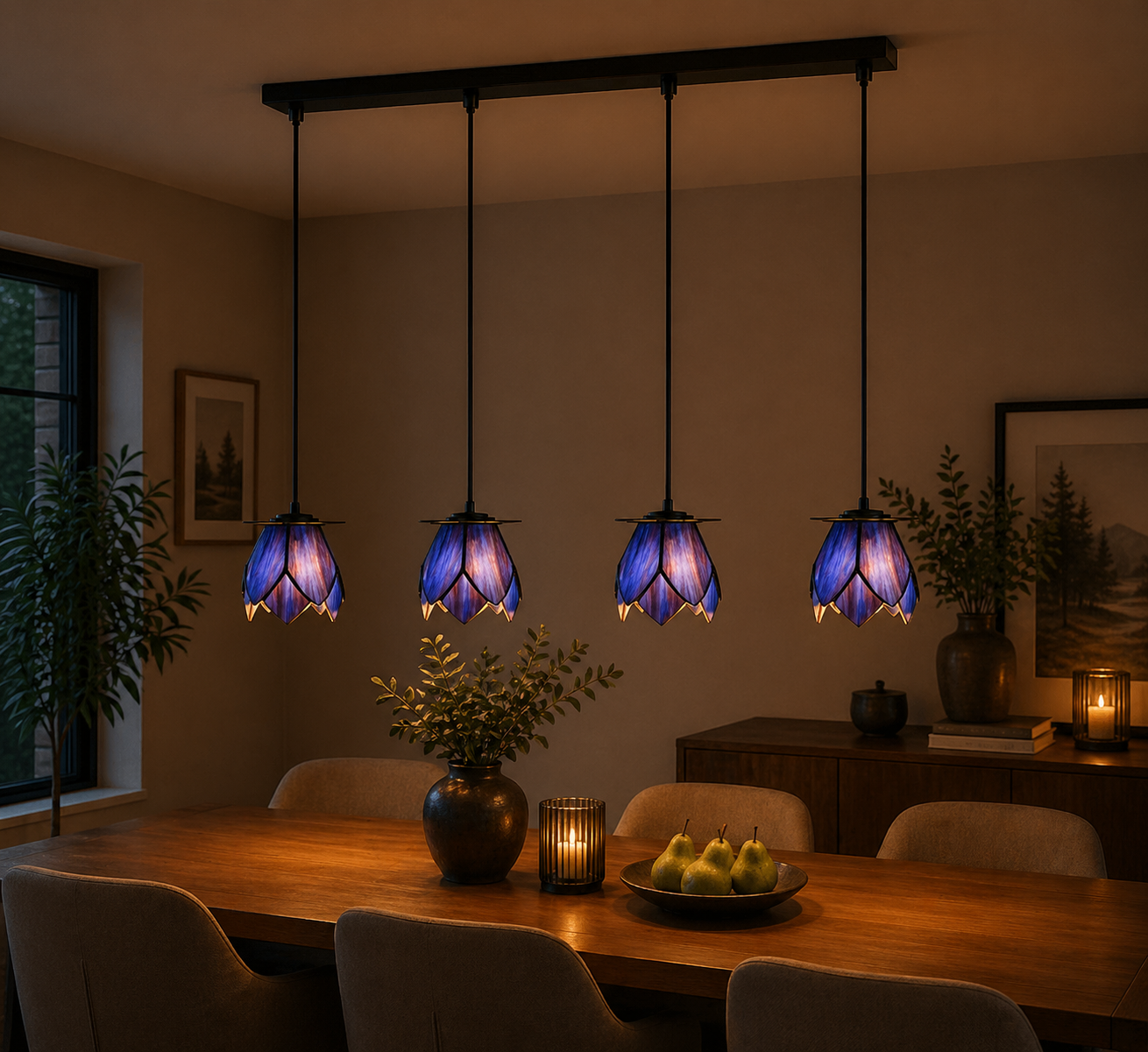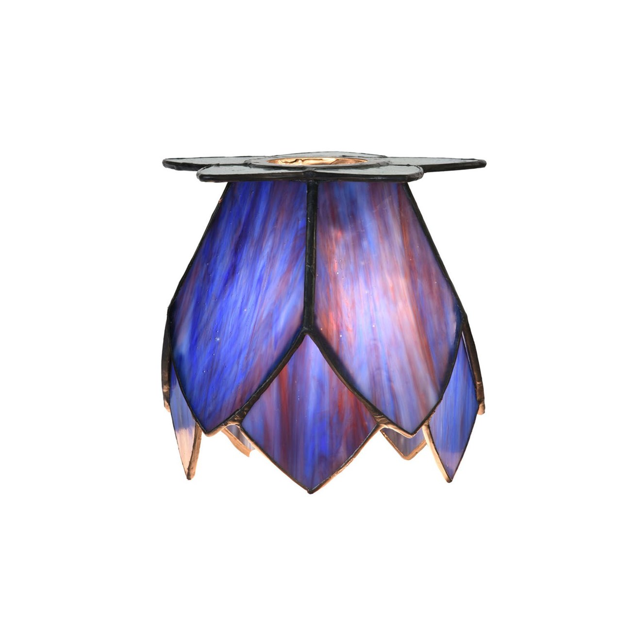 Die Tiffany-Glasschirme sind wie elegante Lotusblüten gestaltet und bestehen aus tiefblauem Glas mit feinen violetten Farbnuancen, die im Licht besonders schön zur Geltung kommen. Die Kombination mit frischen grünen Akzenten an der Basis sorgt für ein harmonisches und natürliches Gesamtbild.