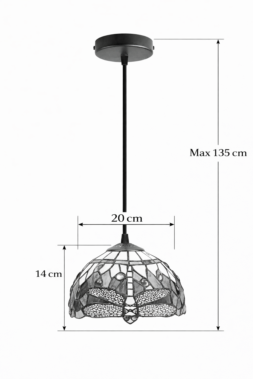Diese Ausführung wird nicht mit Kette, sondern mit einem Kabel von 135 cm geliefert, das sich bei Bedarf einfach kürzen lässt. Ideal für eine moderne Aufhängung mit klassischem Tiffany-Charme.