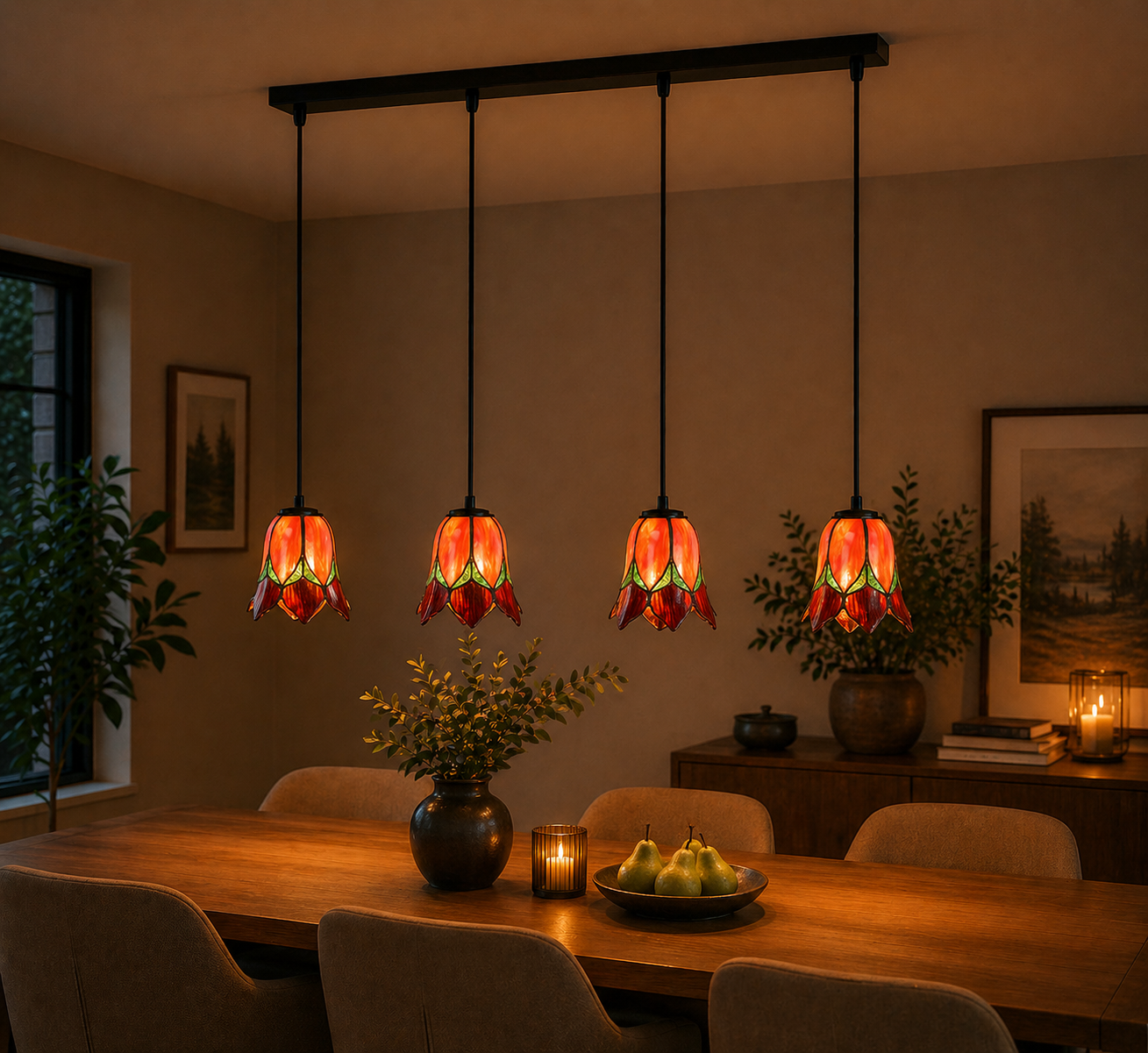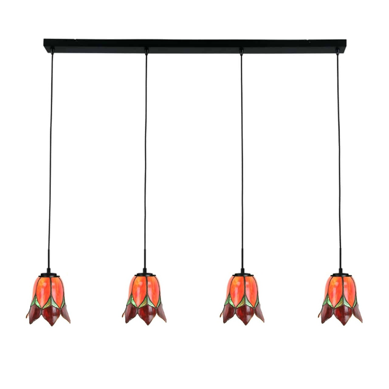 Die Tiffany Hängelampe Lovely Flower Red 4-flammig ist eine romantische und stimmungsvolle Balken-Hängelampe mit Blumenmotiv, ideal für ein warmes und elegantes Ambiente.