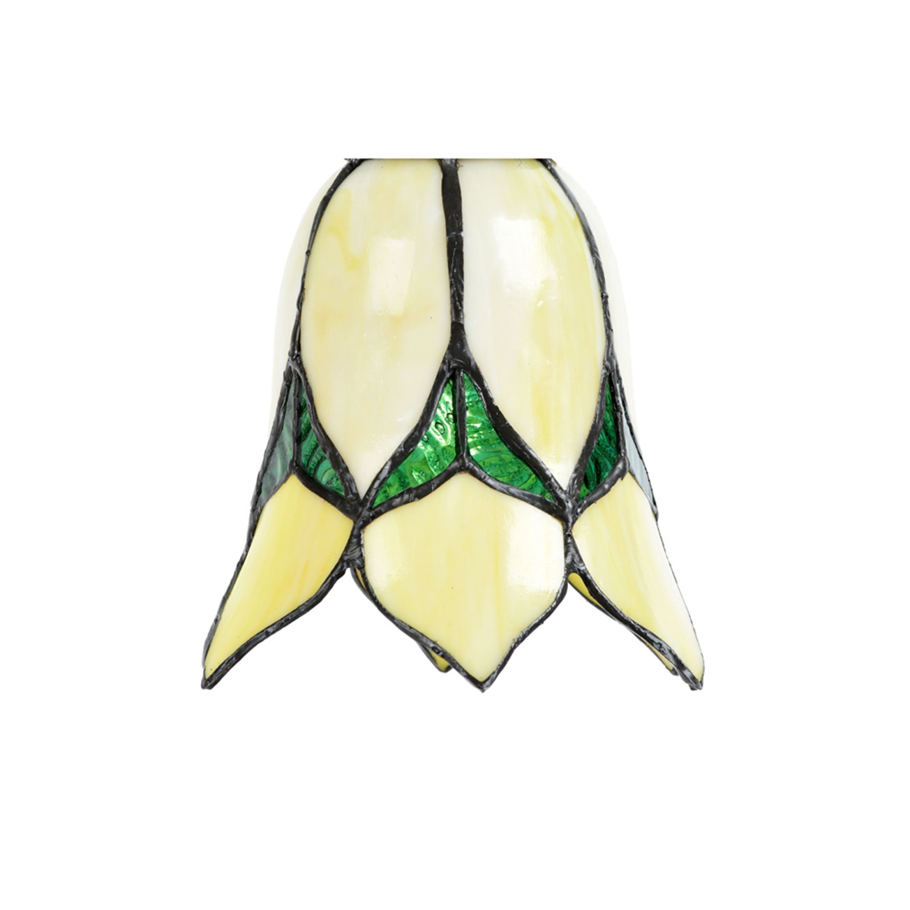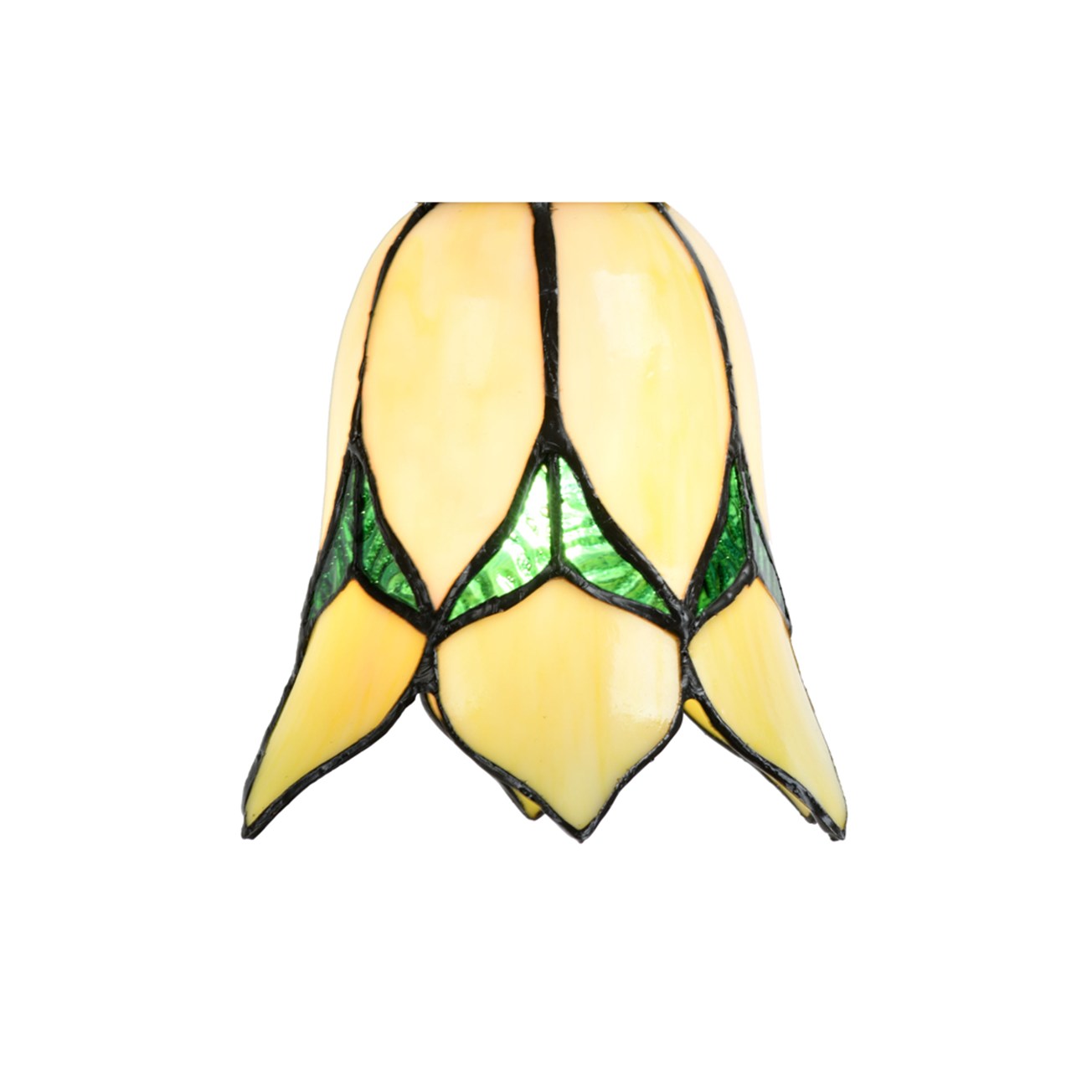 Die Tiffany-Glasschirme sind wie schlanke Tulpen gestaltet und bestehen aus gebogenem Glas in zwei Farben: warmem Gelb und transparentem Grün. Die elegant geschwungenen Blütenblätter verleihen der Lampe eine anmutige Ausstrahlung, während das Farbspiel für ein lebendiges und stimmungsvolles Licht sorgt.