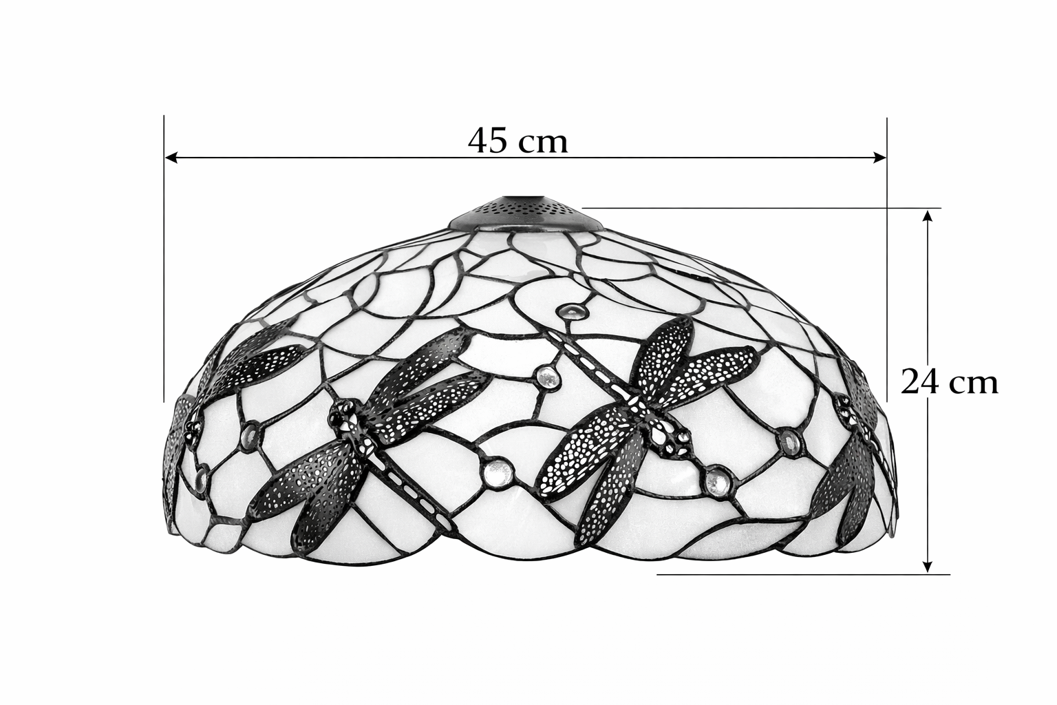 Der Tiffany Lampenschirm Dragonfly Pedrera 45 cm ist ein eleganter Glas-in-Blei Lampenschirm mit Libellenmotiv in hellen Creme- und Naturtönen, ideal zur Erneuerung oder Aufwertung Ihrer bestehenden Leuchte. Der Schirm ist handgefertigt aus echtem Glas, wodurch der typische Tiffany-Effekt und ein warmes, angenehmes Licht entstehen.