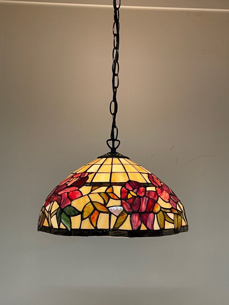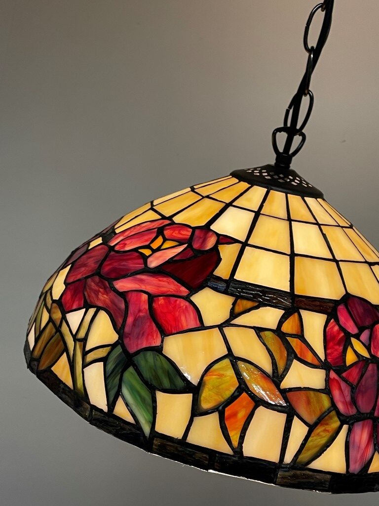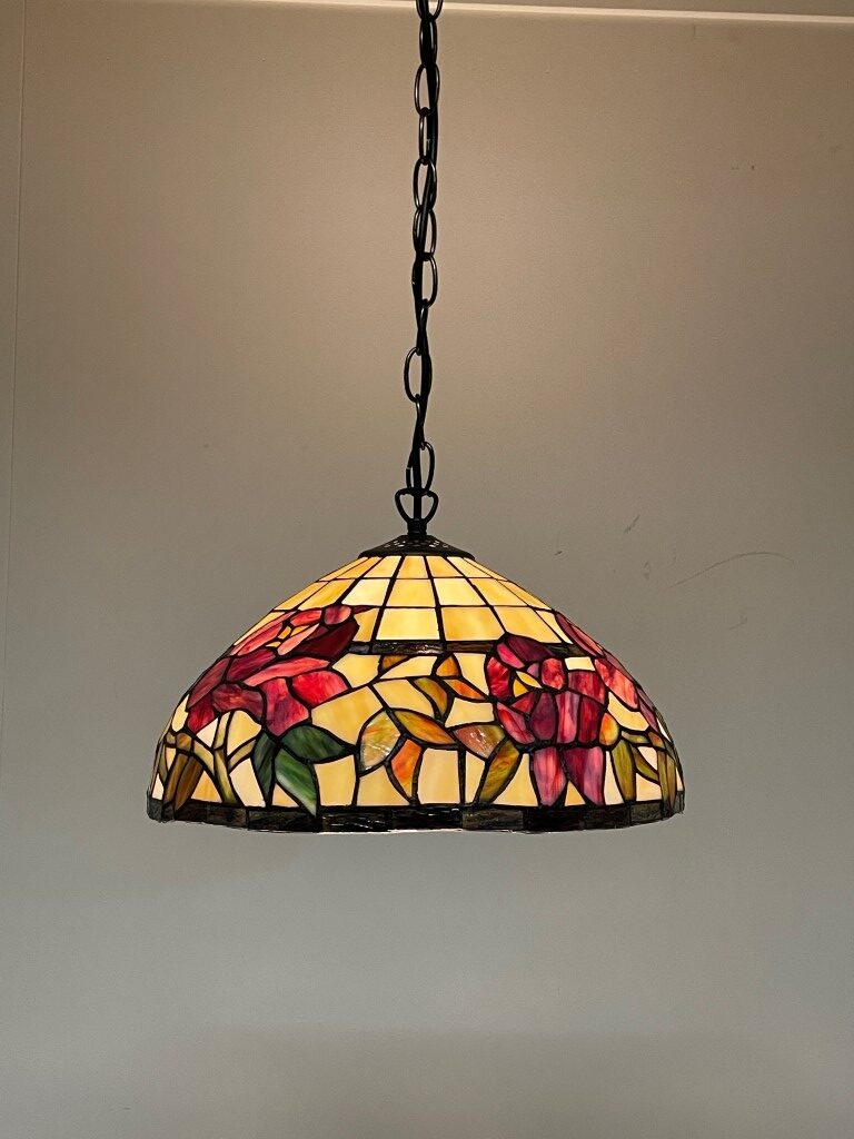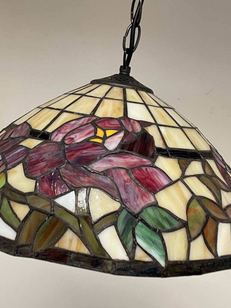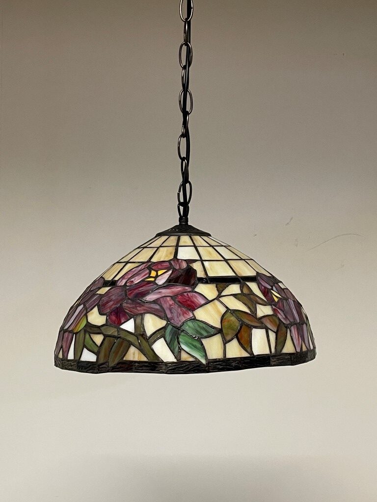 Der Schirm der Tiffany-Tischlampe hat eine florale Bordüre auf cremefarbenem Hintergrund. Das Pendel ist bronzefarben.
