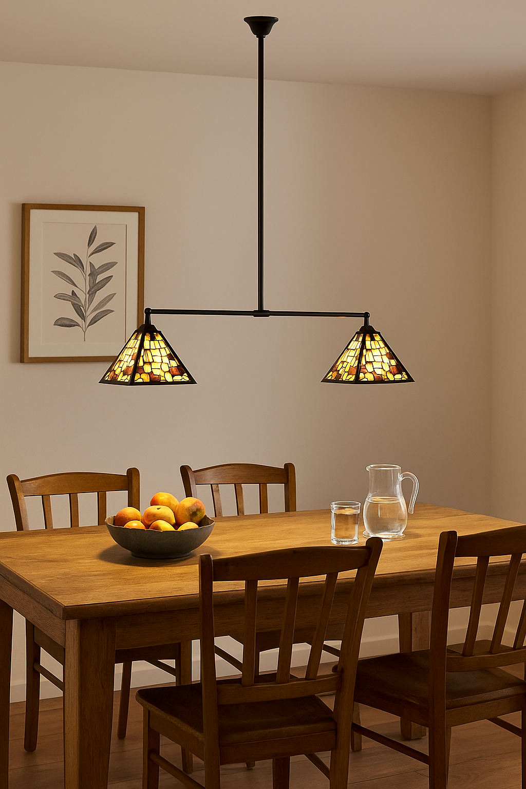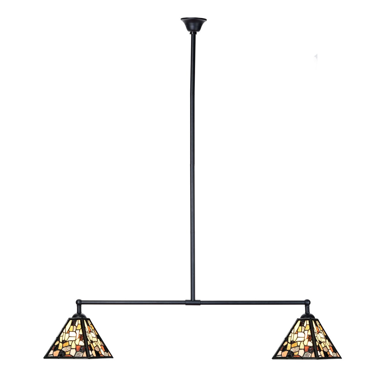 Diese stilvolle Tiffany-Hängelampe kombiniert einen charaktervollen Patchwork-Glasschirm mit einem klaren Metallrahmen, in dem schwarzes Glas die Konturen elegant betont. Die warmen Farbtöne des handgefertigten Glases sorgen für eine stimmungsvolle Atmosphäre – ideal über dem Esstisch oder Kücheninsel.