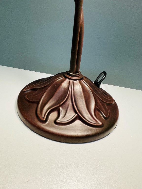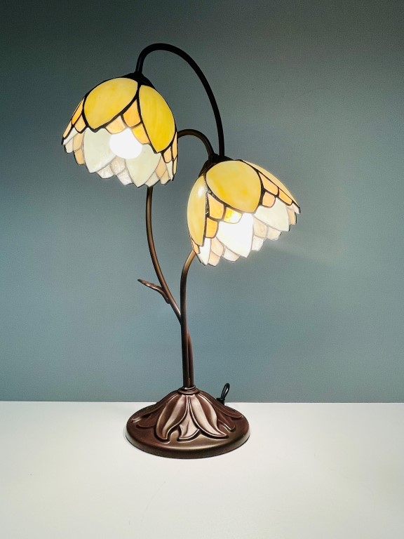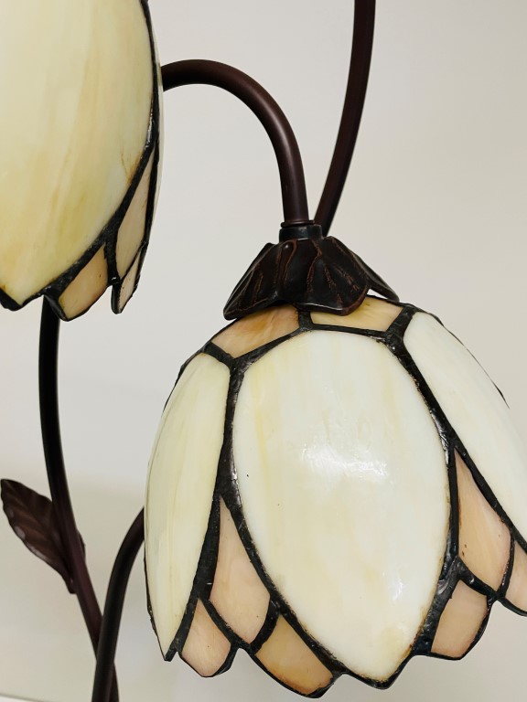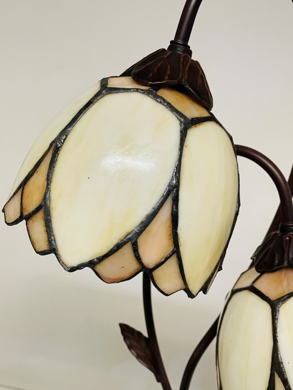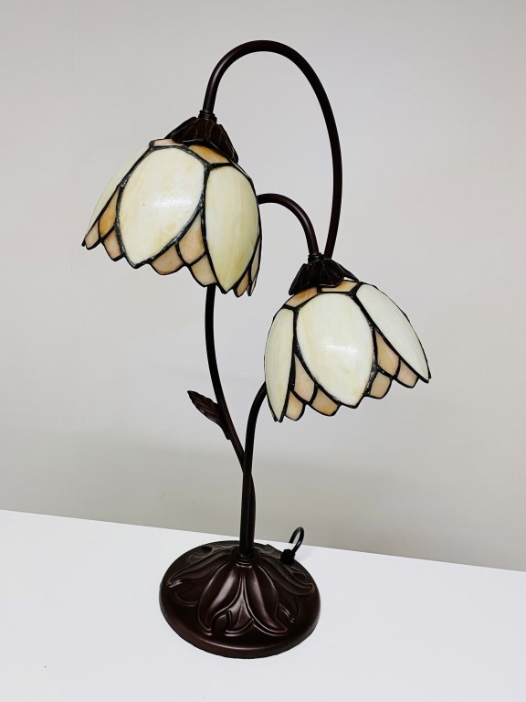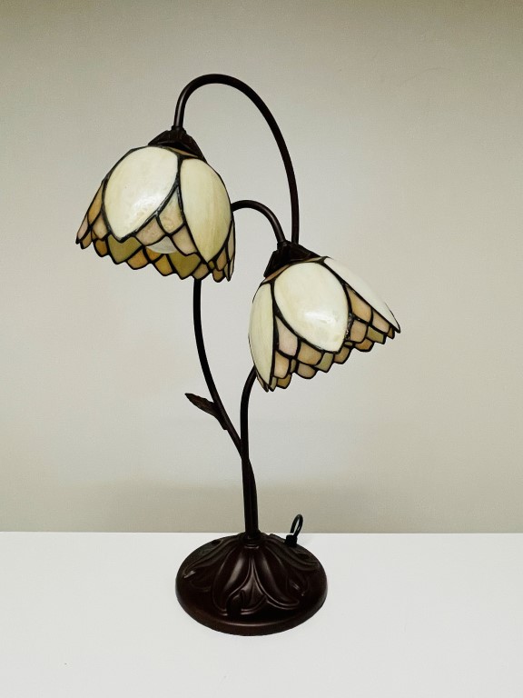 Wunderschöne Tischleuchte in Bronze mit zwei Tiffany-Kappen im Denver-Muster. Schönes cremefarbenes, gebogenes Glas. Ein atmosphärischer Akzent in Ihrem Wohnzimmer