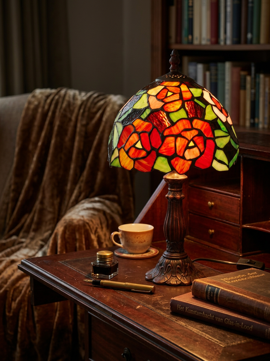 Eine elegante Tiffany Tischlampe mit Rosenmotiv, die Ihrem Wohnraum Atmosphäre und Charakter verleiht.