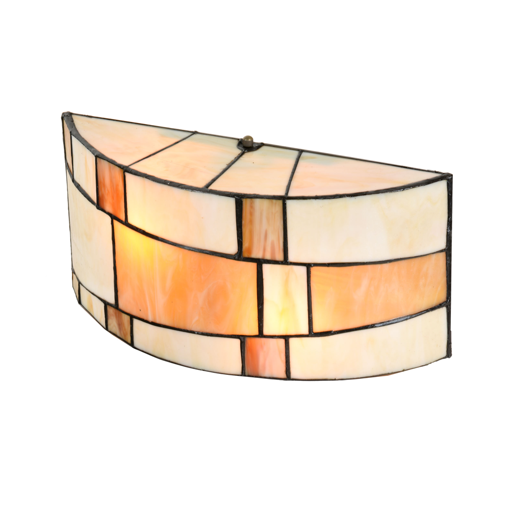 Diese halbrunde Tiffany-Wandlampe / Deckenlampe erzeugt durch den geschlossenen Lampenschirm einen verblüffenden und stimmungsvollen Effekt. Die Farben des Glases sind schwüles Orange und Gelb. Dadurch entsteht ein besonders warmes und sonniges Aussehen. Ein grandioses, „weltliches“ Gefühl wird durch den Blick auf die Seiten dieser Lampe hervorgerufen!
