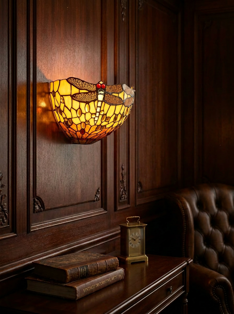 Eine stilvolle Tiffany Wandleuchte mit Libellenmotiv in Amber für eine warme und elegante Atmosphäre.